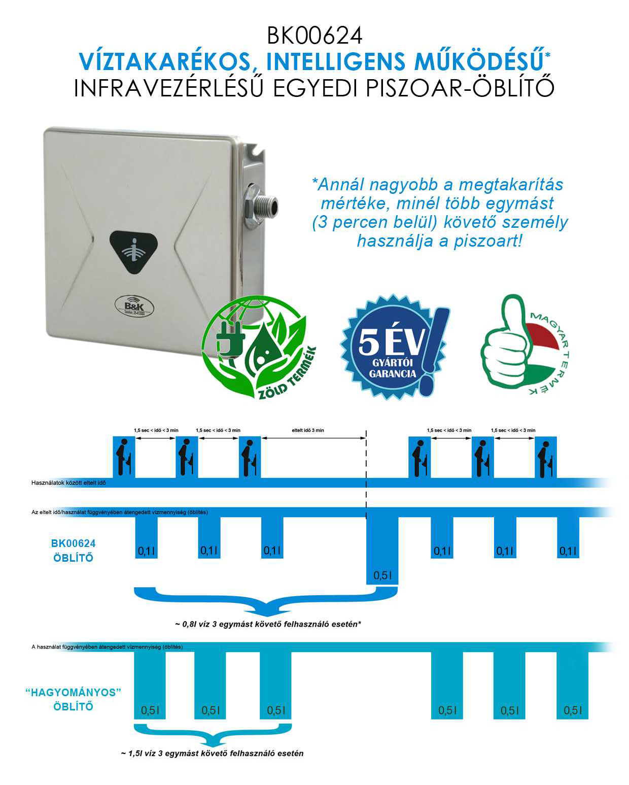 A B&K Kft. első saját terméke egy infrás piszoár-öblítő volt. Egyértelmű hát, hogy az azóta eltel idő jelentős fejlődést hozott a vizelde öblítők terén is. A fejlődés egyértelműen jelentkezett az vizelde öblítést vezérlő elektronikákban, választékunkban megjelent a SMART, azaz intelligens öblítési rendszer, amely a forgalomhoz igazítja a vizeldék öblítését, így a nagyforgalmú nyilvános WC-k esetében jelentős vízmegtakarítás érhető el.